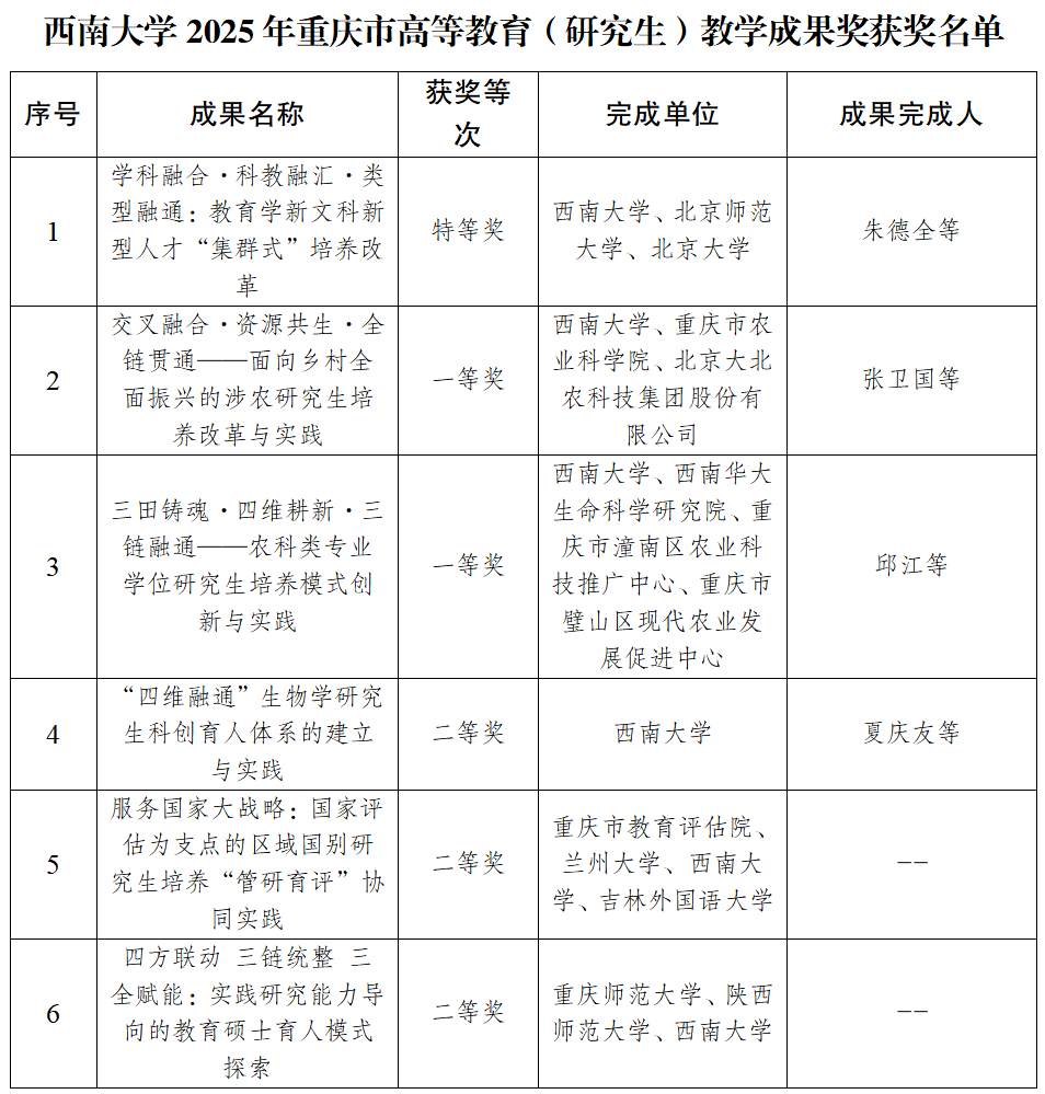 重庆市人民政府正式发布2025年重庆市教学成果奖获奖项目名单,学校在高等教育(研究生)类别中荣获6项奖励,包括以第一完成单位获得的特等奖1项、一等奖2项、二等奖1项,以及作为主要合作单位获得的二等奖2项。
