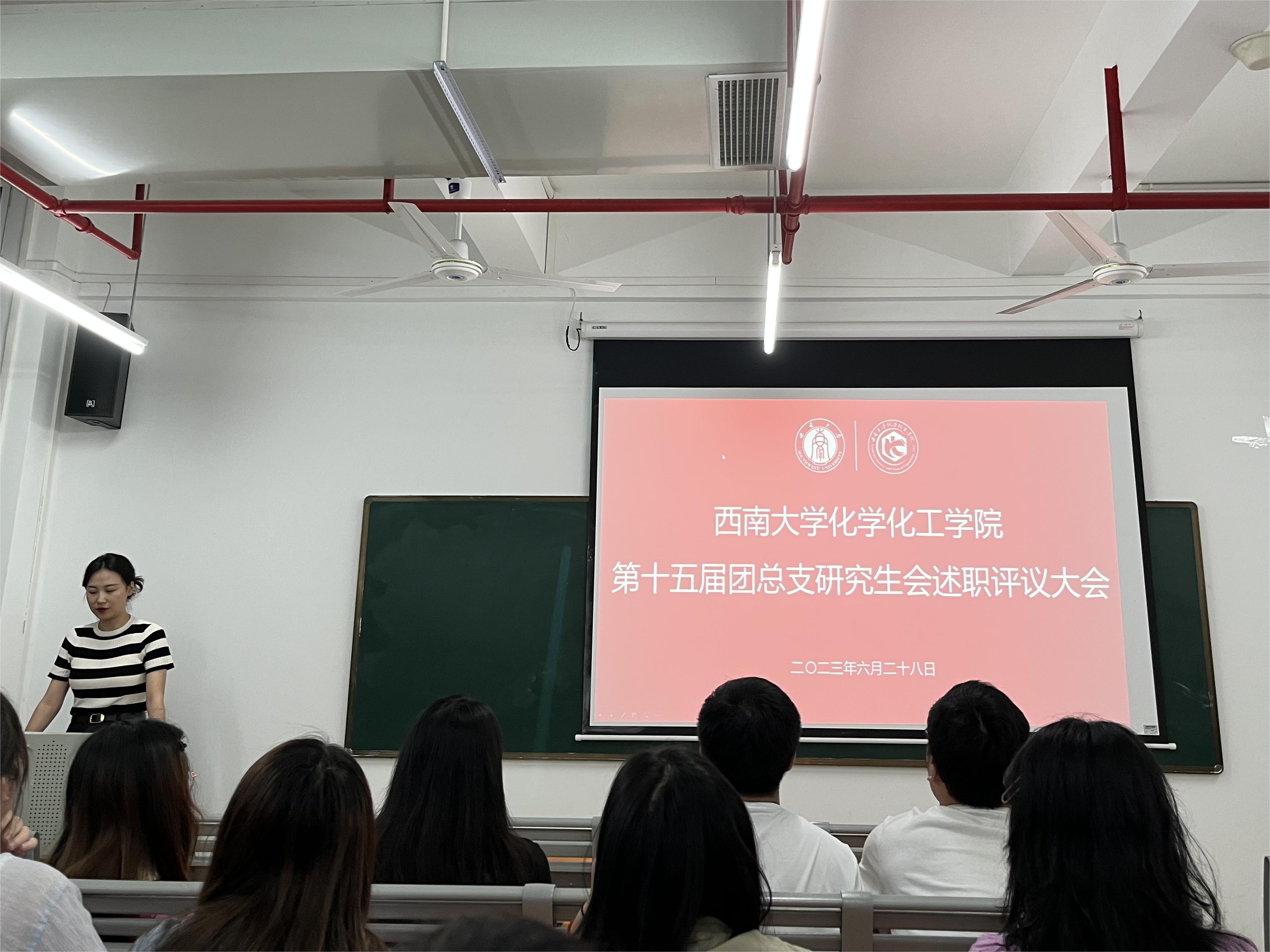 为全面贯彻党的二十大精神,持续深化化学化工学院团总支研究生会组织改革,进一步推进团总支研究生会各项工作开展,根据《关于做好西南大学 2022-2023 学年二级培养单位研究生会述职评议会工作的通知》相关要求,化学化工学院于2023年6月28日晚7点于化院235教室开展化学化工学院2022-2023年第十五届团总支研究生会述职评议大会。研究生辅导员杨思清老师以及全体研会成员出席本次会议。本次活动由研究生会主席荣宇主持。