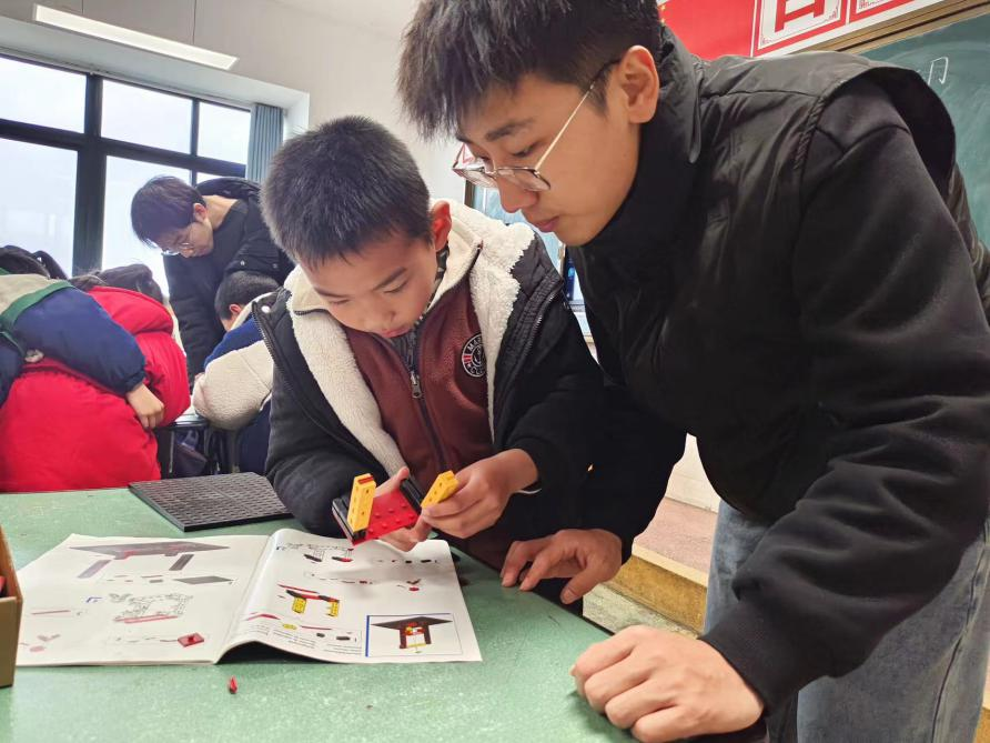 图9:队员刘保通和任安华教小朋友们拼装积木